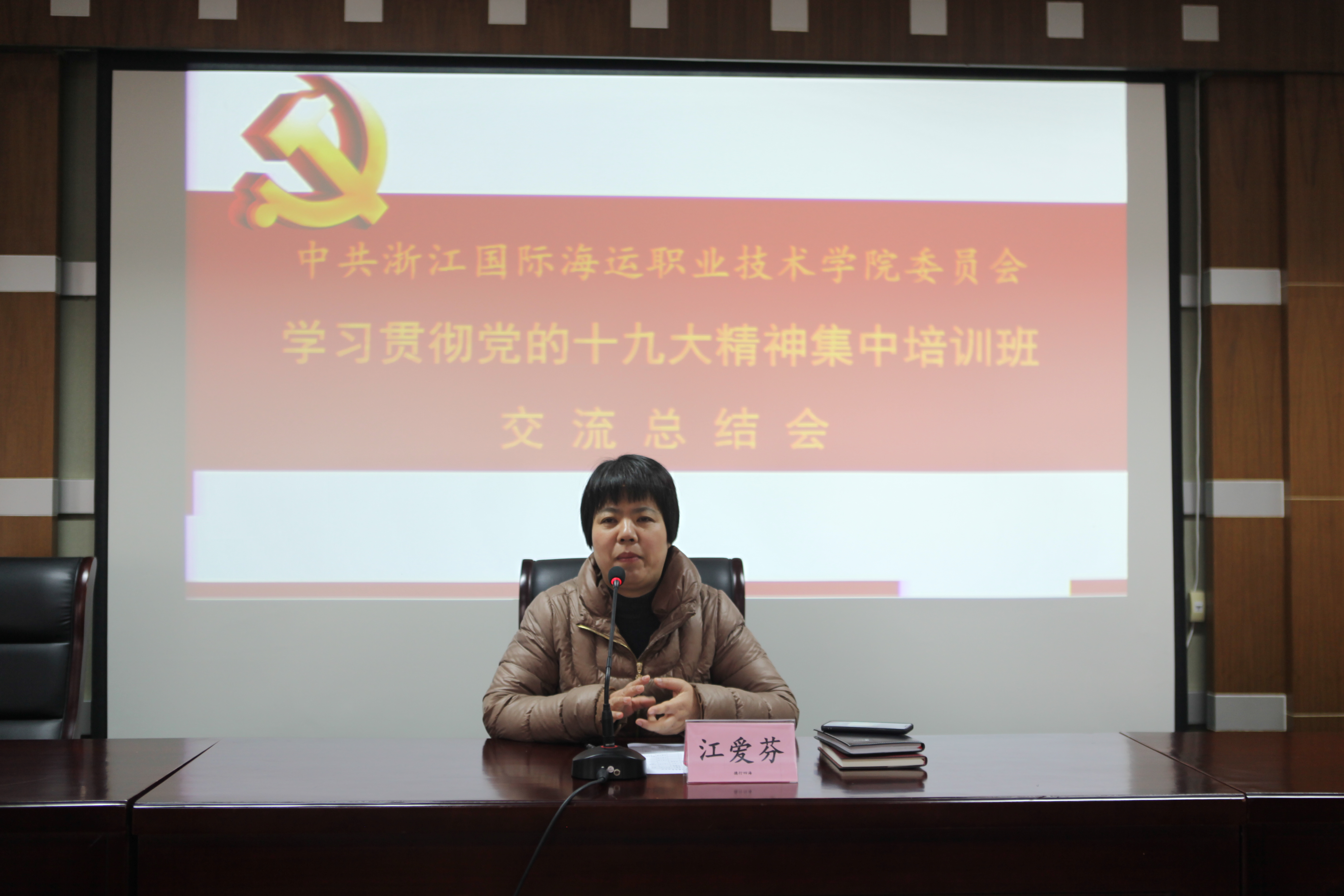 在结业会议上,中层干部汪益兵、韩开封、刘笑菊、李晓璐分别代表各自小组围绕学习研讨情况和培训心得体会作交流汇报。学校党委委员、纪委书记、组织部部长江爱芬总结发言,并提出了四点希望:一是要学懂弄通做实十九大精神;二是要敢于创新,增强责任感;三是要以十九大精神为指导武装头脑,解决实际问题;四是要增强服务意识,主动作为。