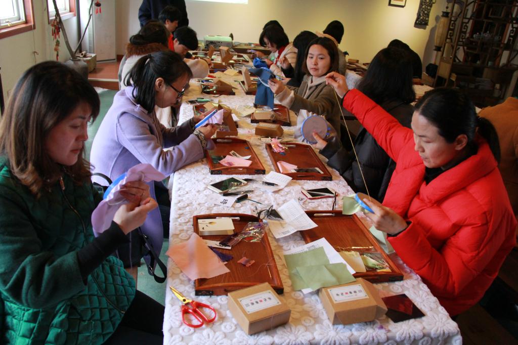 3月7日中午,在教学楼3508香道室里,由校妇委会、女职委组织的香道培训正火热进行。在郭娟老师的指导下,女职工们跟着教学视频一步步实践,大家从简单易入门的星座、特色字刺绣入手,描图案、套绣绷、回针绣、挂流苏、制香包……一个个小巧玲珑、绣工精美的香囊就做成了,馥郁香气弥漫至教室的各个角落和大家心中。(金巧娟)