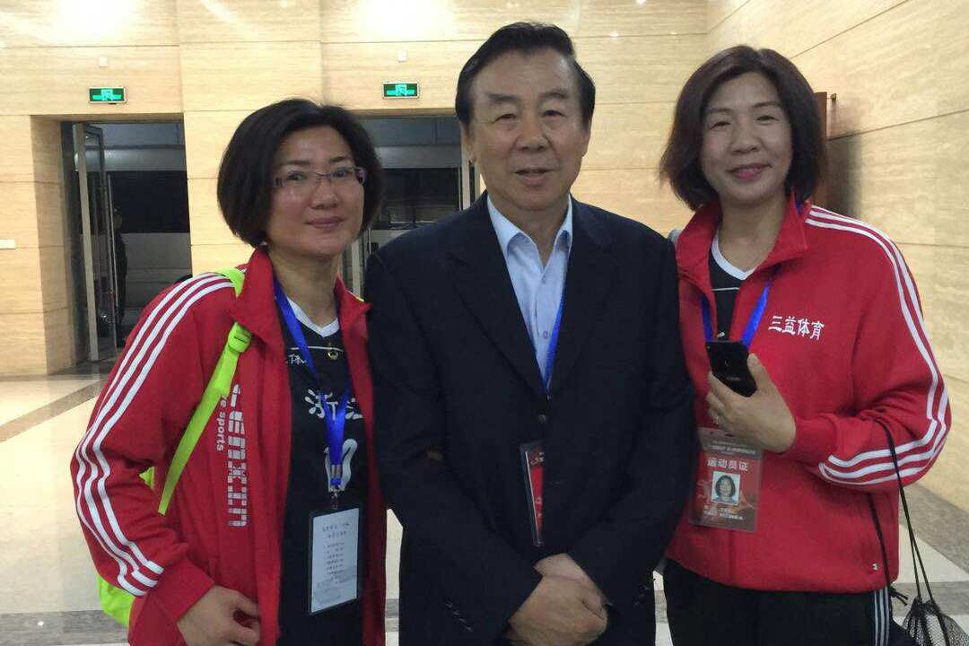 原国家体育总局局长、中国排球协会主席袁伟民(中)与王安芬老师(右一)亲切合影