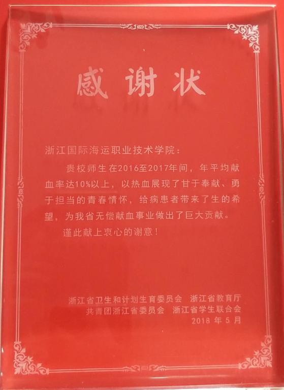 我校自2007年与舟山市中心血站联合开展志愿无偿献血活动以来,在每年6月14日世界献血日及12月5日国际志愿者日期间,学校均会组织师生进行无偿献血活动。2016-2017年,我校师生献血量为30万余毫升,年均献血率为10%以上,位列全省高校第9名。