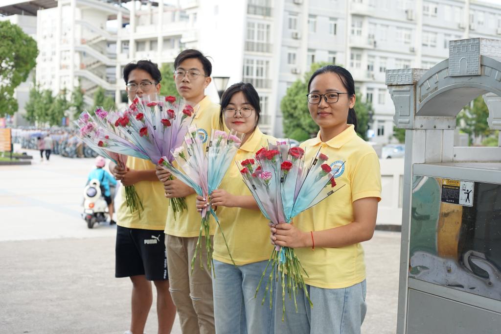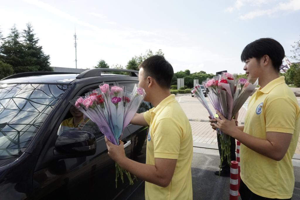9月10日上午,校团学干部们手捧鲜花,早早等候于南、北校门口。一枝淡雅的康乃馨、一个灿烂的微笑、一声真挚的问候,都代表着同学们对老师的情意。老师们感受到学生的热情与心意,纷纷以欣慰的笑容作为回应。