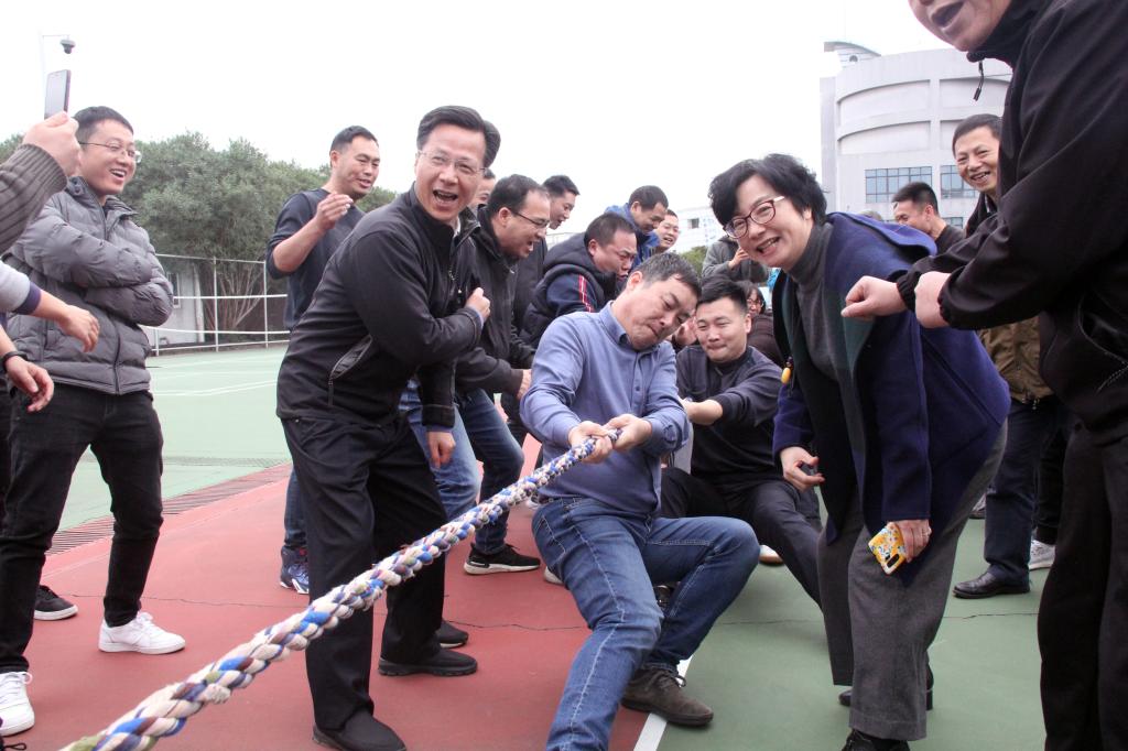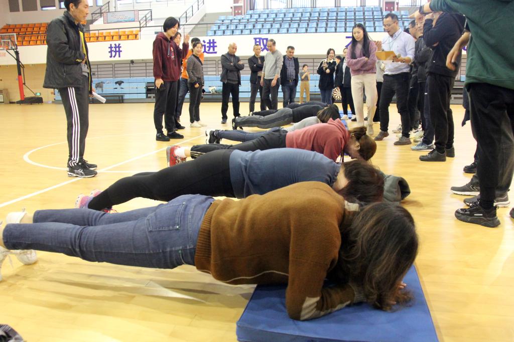 本着“友谊第一、比赛第二”的原则,以二级工会为单位组队的代表队进行了立定跳远、1分钟跳绳、平板支撑、飞镖、男子引体向上、男子俯卧撑、女子仰卧起坐、 女子夹玻璃球等8个个人项目和双腿夹排球接力、同心鼓、跳长绳、拔河等4个团体项目的比赛。虽然学校运动场建设场地受限,但依然挡不住全体教职工积极参与比赛的火热之情。教职工们热情高涨,篮球场上加油助威,呐喊声此起彼伏,运动员们奋力拼搏、团结协作,表现出良好的团队合作精神和强烈的集体荣誉感。