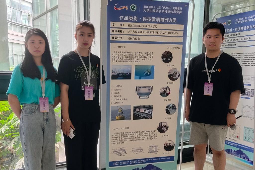 本届大赛共有106所高校、4万余名大学生积极参赛,1633件作品经遴选入围省级复赛,50所高校323件作品入围省级决赛。我校《基于大数据背景下船舶除污机器人应用技术研究》入围省级决赛,经作品展示、团队陈述和专家问答等多重评审,最终获省赛二等奖。《交互式在线监测安全帽研发》、《基于机器视觉的智能鱼肝油检测与自动选别系统》、《“智”惠夕阳——“互联网+”背景下舟山市城镇智慧养老服务现状调查研究》、《易拆者—基于卧式千斤顶的大型汽车制动鼓拆卸装置》和《东海夫人——休闲调味贻贝食品研发》等五个项目获省赛三等奖。