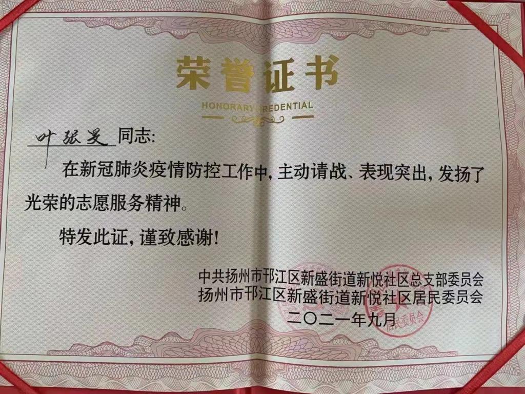 在志愿服务开展的过程中,从疫情初期人员登记,到核酸检测结果扫描,从为医护人员消菌杀毒、搬运防疫物资,到为居民送菜做好后勤保障服务,哪里需要人哪里就有他的身影,叶张旻认真、勤恳、积极的态度得到了当地社区的肯定和表扬。20219月,社区授予叶张旻“抗疫志愿服务”荣誉证书,并特意向我校发来了感谢信。