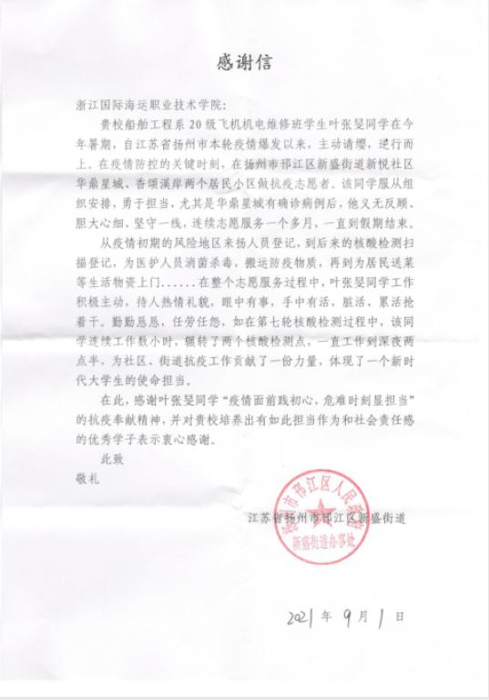 暑假期间,江苏扬州疫情爆发的消息突如其来,我校海洋装备工程学院的2020级飞机机电维修班叶张旻同学主动请缨,在暑假期间投身到抗疫第一线,在疫情防控的关键时刻,连续开展志愿服务1个多月,充分体现了一名新时代大学生的担当和使命。