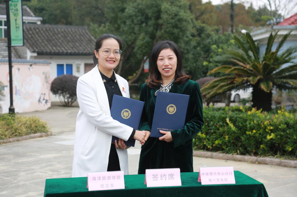 活动现场举行了党建共建合作签约仪式,海洋旅游学院党总支书记徐盈与中信银行舟山分行第一支部书记蒋孟伦分别代表双方签订了党建共建协议书。这也标志着两个党组织在构建资源共享、优势互补、共同发展的“党建+”方面迈出重要一步。