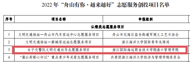 在2022年“舟山有你·越来越好”志愿服务集市创投活动中我校共申报志愿服务项目6个,3个获市级立项。其中,学校青年志愿者总队的“银龄跨越数字鸿沟”科普志愿服务项目和港口管理学院的女子交通队文明交通劝导志愿服务项目被舟山市精神文明建设委员会办公室、共青团舟山市委员会、舟山市志愿者协会立项;海洋装备工程学院“同舟基金”志愿服务队的“健康科普促成长,倡导文明新读者”慈善志愿服务项目被舟山市慈善总会、共青团舟山市委立项。
