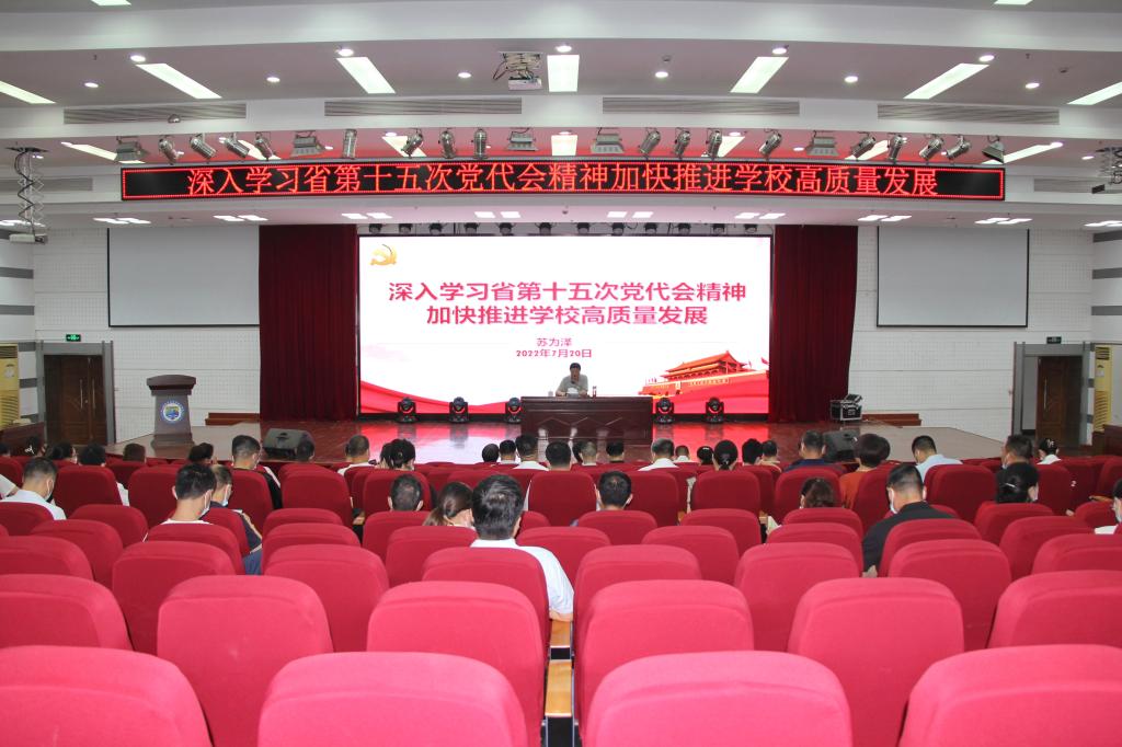 7月20日上午,学校在图书馆四楼报告厅举行了学习省第十五次党代会精神宣讲会。学校党委书记苏为泽以《深入学习省第十五次党代会精神 加快推进学校高质量发展》为题讲授党课,全体校领导、中层干部、主管干部、各党支部书记、2021级邮轮6-7班学生和部分教师代表参加。