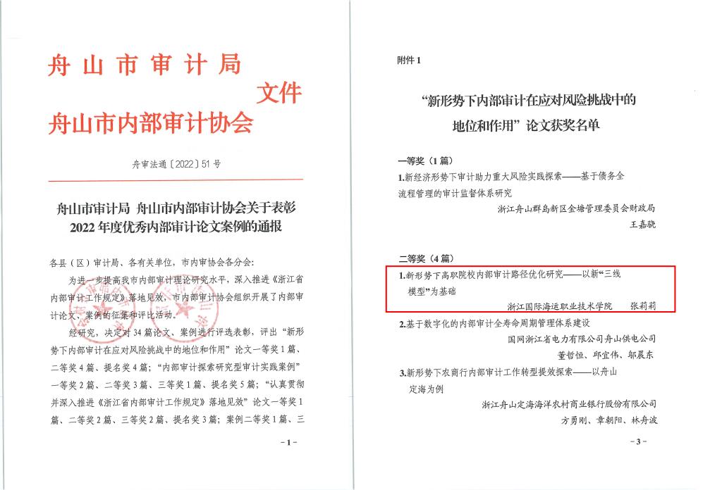 近日,浙江省内部审计协会公布了2022年度优秀内部审计论文、案例评审结果,我校审计处张莉莉同志撰写的论文《新形势下高职院校内部审计路径优化研究——以新“三线模型”为基础》荣获“新形势下内部审计在应对风险挑战中的地位和作用(全国统一课题)”论文评比三等奖、同时也获得了舟山市内部审计协会论文评比二等奖。