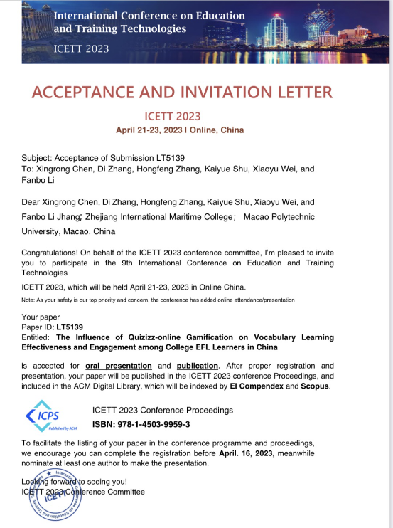 4月21日-4月23日,第九届国际教育与培训技术会议(ICETT)在中国澳门召开。我校国际教育学院陈星蓉老师的论文 《The Influence of Quizizz-online Gamification on Vocabulary Learning Effectiveness and Engagement among College EFL Learners in China》顺利通过会议组委会基于原创性、学术贡献、会议相关性等双盲评审与专业评审。陈星蓉老师受邀参加了本次线上会议,并在会议上作了汇报,介绍了游戏化教学程序Quizizz如何影响中国大学英语学习者的词汇学习效率和学习参与度。该论文在会后被收录至ACM在线数据库,提交 EI Compendex 和 Scopus 等检索。