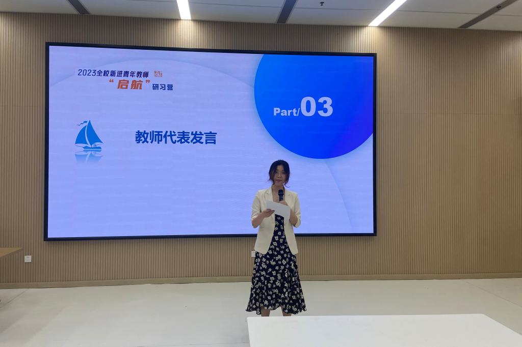 国际教育学院的沈楷雯老师作为本届研习营参训教师代表进行了表态发言。她代表参训教师感谢学校提供的培训学习机会,聆听专家、同行的宝贵经验,将引领青年教师更好地应对教育挑战,对未来的教育工作产生积极影响。