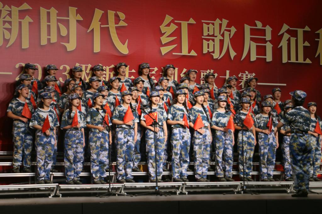 经二级学院选拔推荐,共有十支新生合唱队参加比赛。飞扬的歌声吟唱难忘的峥嵘岁月,熟悉的旋律演绎时代的绚烂乐章。各队伍有序上场,嘹亮的歌声响彻了整个田径场。