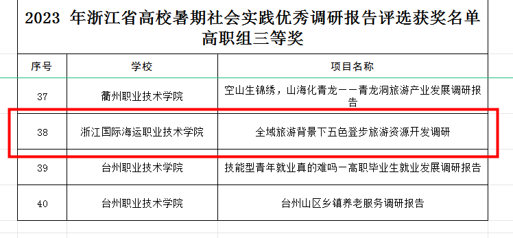 近日,由中共浙江省委宣传部、浙江省教育厅、共青团浙江省委、浙江省学生联合会等部门联合主办的2023年浙江省高校暑期社会实践优秀调研报告评选决赛圆满结束。全省共有94所高校限额推报606份调研报告参与评选,我校共推报6项作品,其中由王静飞、孙峰、潘以宁老师指导的《全域旅游背景下五色登步旅游资源开发调研》荣获高职组三等奖。