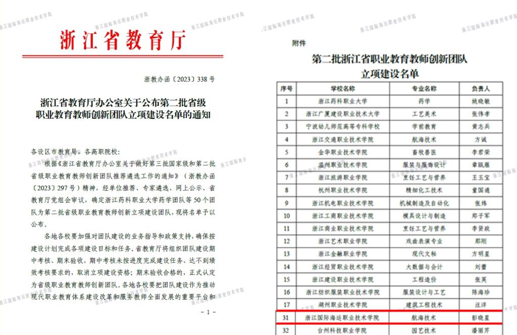 近日,浙江省教育厅公布了第二批浙江省职业教育教师创新团队立项建设名单,我校航海工程学院航海技术专业教师教学创新团队成功入选。这是我校首次成为省级职业教育教师教学创新团队建设单位,实现了师资队伍建设省级项目“零”的突破,也是我校“双高”建设取得的又一项高质量的标志性成果。