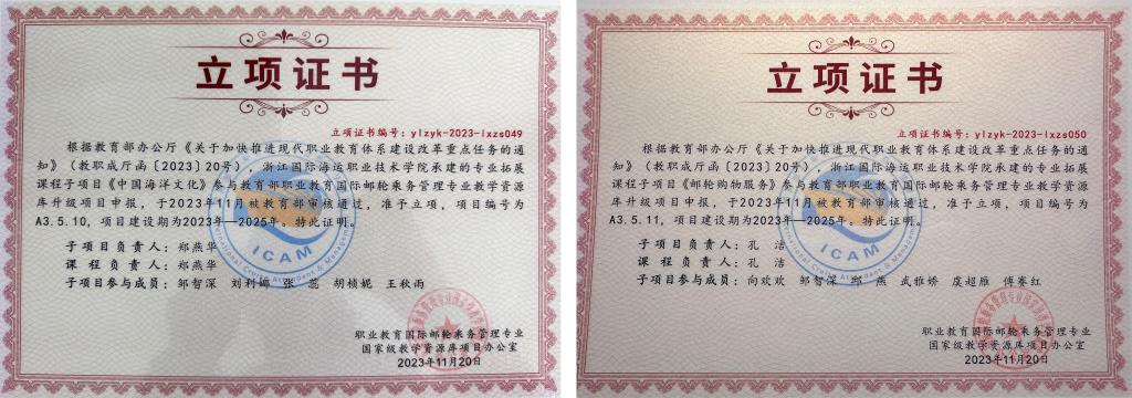 依托协同发展联盟的平台作用,我校承建的《邮轮购物服务》《中国海洋文化》两门课程参与教育部职业教育国际邮轮乘务管理专业教学资源库升级项目申报,于2023年11月被教育部审核通过,准予立项。