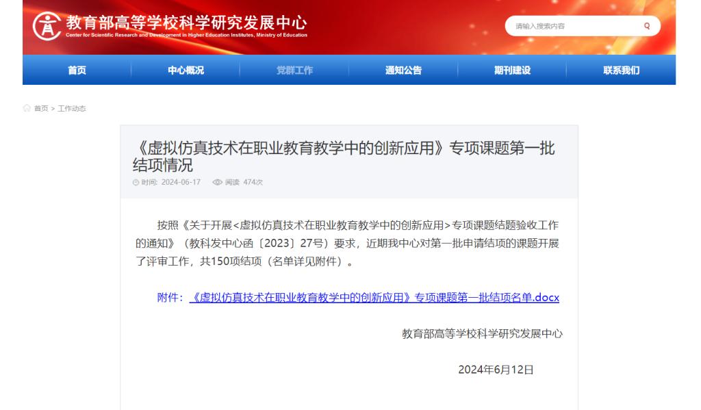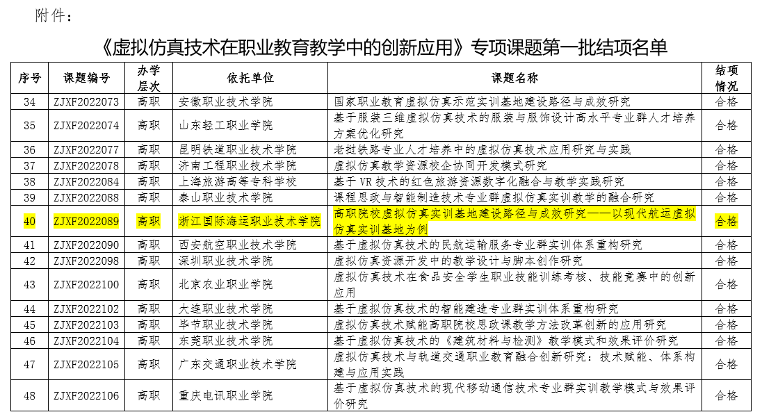 近日,教育部高等学校科学研究发展中心公布了《虚拟仿真技术在职业教育教学中的创新应用》专项课题第一批结项通知。由我校航海工程学院郝永志博士主持的《高职院校虚拟仿真实训基地建设路径与成效研究——以现代航运虚拟仿真实训基地为例》(立项编号ZJXF2022089)顺利通过验收。