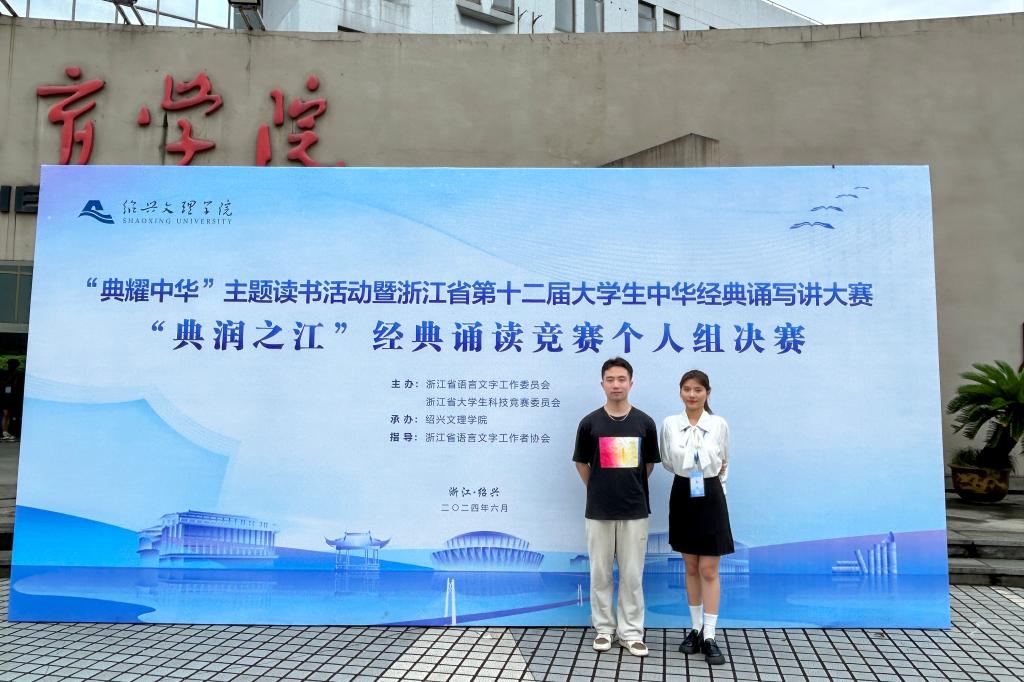 书香恒久远,经典咏流传。6月22日-23日,由浙江省语言文字委员会、浙江省大学生科技竞赛委员会主办的“典耀中华”主题读书活动暨浙江省第十二届大学生中华经典诵写讲大赛“典润之江”经典诵读竞赛决赛在绍兴文理学院圆满结束。本次大赛分本科组和专科组两个组别,其中,入围此次决赛的高职高专院校共计38所,选手96人。经过激烈角逐,我校石油化工学院2023级石油化工技术1班的徐昊韩同学、海洋旅游学院国际邮轮乘务专业的葛洪霞同学,凭借优异的表现,分别斩获大赛一、二等奖;海洋装备工程学院何子悦,海洋旅游学院的陆奕玮、孙雅楠、王世豪,现代港口贸易学院吴垚雅等五名同学还获得大赛三等奖。