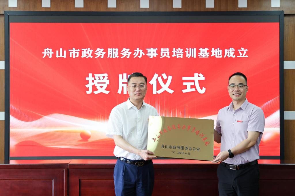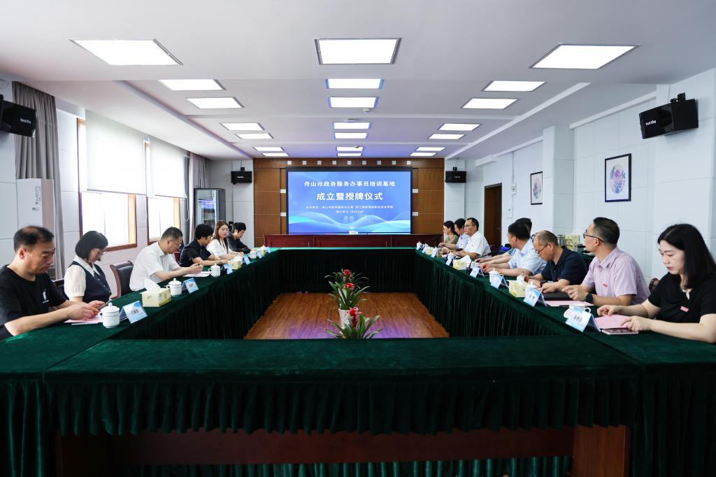 为加快技能人才培养,提高政务服务质量,进一步优化舟山市营商环境,6月28日,舟山市政务服务办事员培训基地在我校挂牌成立,这标志着舟山市在推进政务服务标准化、规范化、专业化的道路上迈出了新步伐。舟山市政务服务办公室党组书记、主任丁伟民,党组成员、副主任孙晓华,校党委书记苏为泽,校党委委员、副校长夏志刚等领导及市政务服务办相关处室长、学校相关部门负责人,参加了基地成立暨授牌仪式。