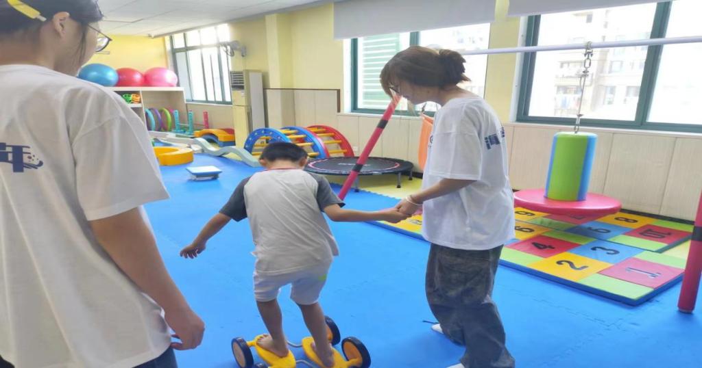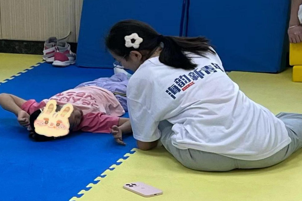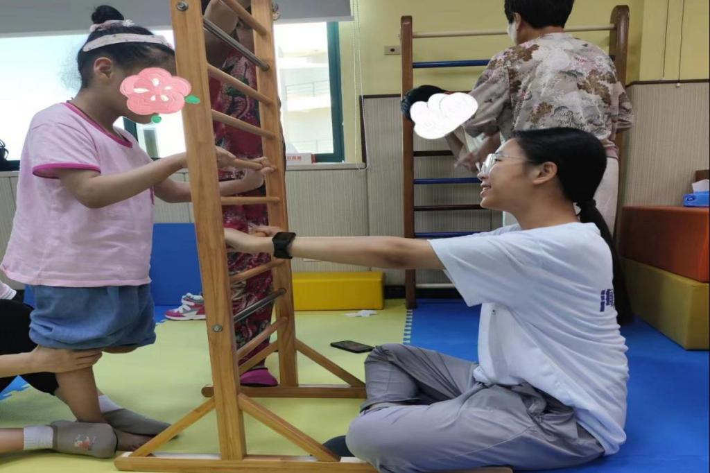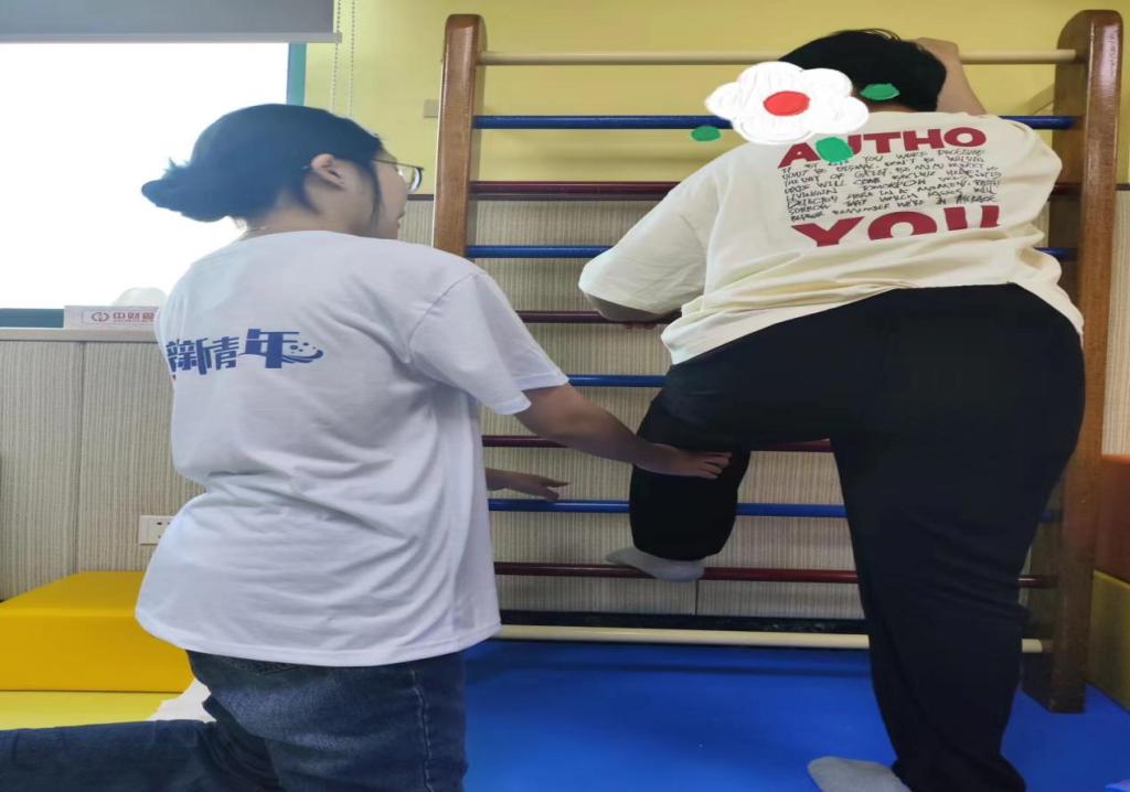 第一天的活动中,志愿者们早早抵达康复中心,与孩子们进行了亲切的交流。在接下来的康复课程中,志愿者们仔细观察并参与到孩子们的治疗与锻炼中,切身感受到了残疾儿童小小的身躯所蕴含的大大能量,不仅认真协助特教老师帮助孩子们进行腿部、上肢、平衡性等康复训练,还积极鼓励孩子们勇敢地面对困难,用乐观的心态迎接挑战。