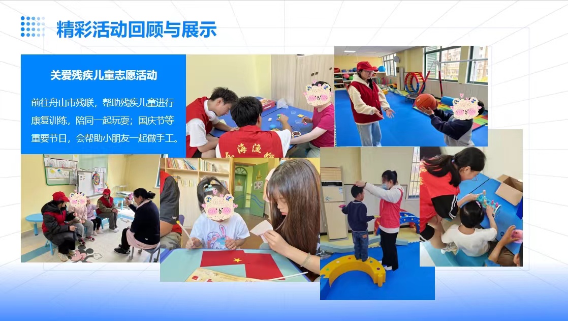 一年一度的暑期社会实践活动虽然结束了,但是我校大学生的爱心传递从未间断。我校爱心社自2006年成立以来,一直与舟山市残联结对定期开展各类爱心助残活动。例如,为残联儿童提供一对一或小组形式的学习辅导,帮助他们克服学习上的困难;组织康复训练活动,提升他们的身体机能;开展心理咨询和疏导服务,关注他们的心理健康等。通过定期回访、评估帮扶效果等方式,不断调整和优化帮扶计划,确保残联儿童能够得到持续、有效的帮助。
