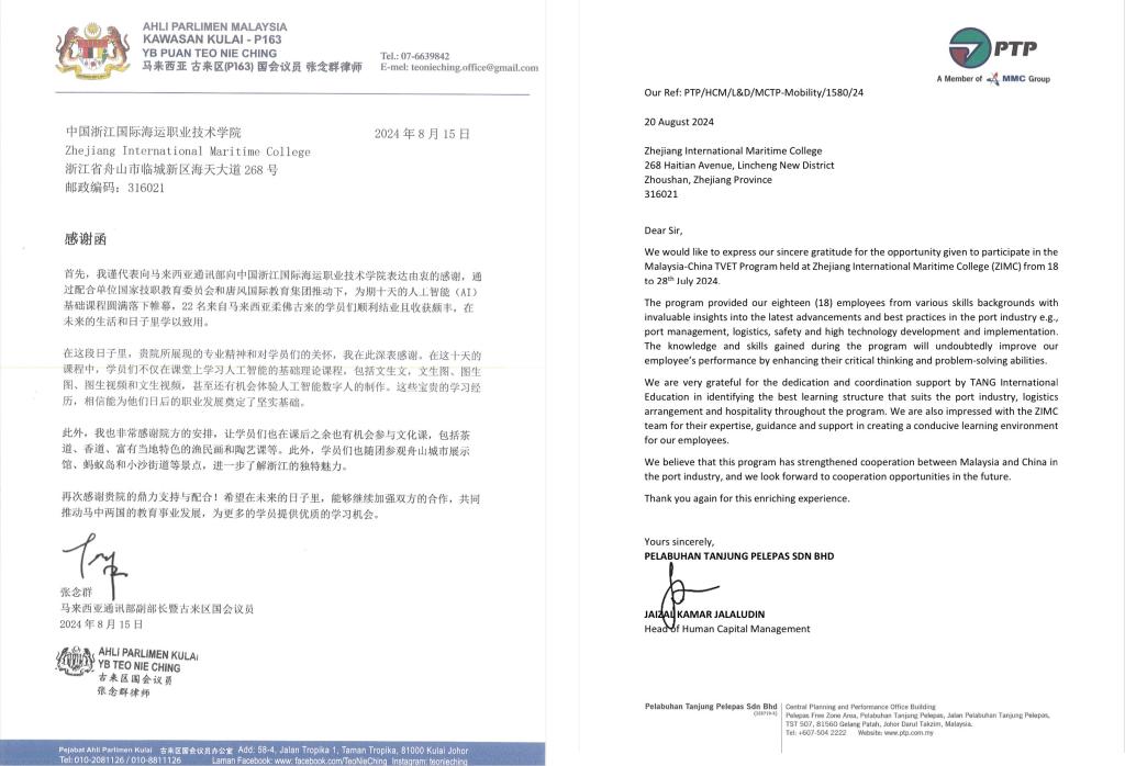 近日,马来西亚通讯部副部长暨古来区国会议员张念群女士与马来西亚丹戎帕拉帕斯港人力资本管理部主任JAIZAL KAMAR JALALUDIN分别向我校发来了感谢信。衷心感谢我校“中马青年职教培训项目”的举办以及在培训过程中的专业指导和周到服务,并高度评价了此次培训内容的实用性和针对性,为参加培训的40名学员的未来职业发展奠定了坚实基础。