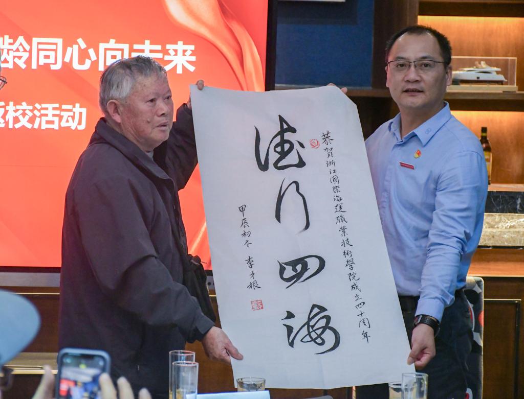 退休教师代表孙静波、李才根老师分别分享了自己的教学经验、人生感悟及退休后的点滴,为师生们送上了宝贵的建议和祝福。李才根老师还向学校赠送了自己书写的校训“德行四海”。