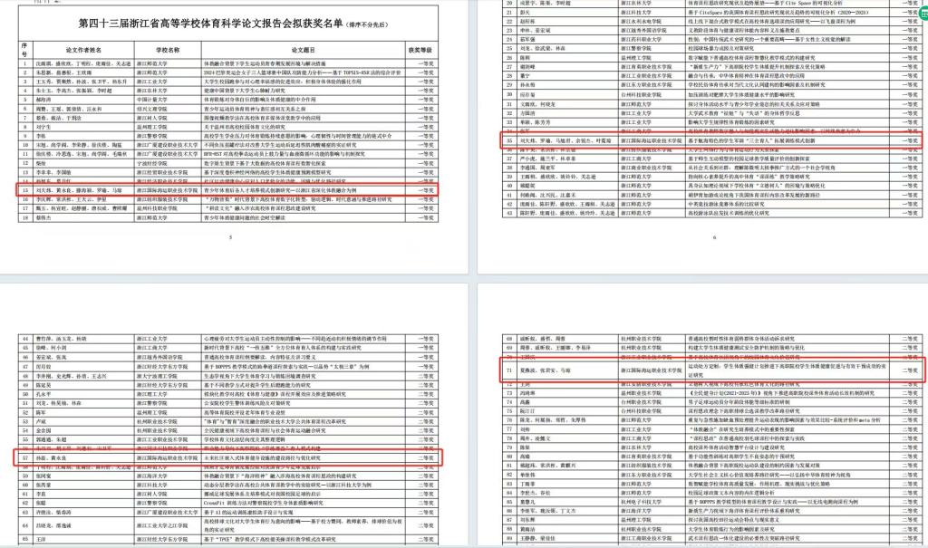 我校在本次报告会上表现突出,共参与投稿4篇,其中刘大炜老师撰写的两篇论文《基于航海特色的学生军训“三全育人”拓展训练模式创新》、《青少年体育后备人才培养模式创新研究—以浙江省深化体教融合为例》均荣获一等奖;夏燕波老师撰写的《运动处方定制:学生体质强健计划推进下高职院校学生体质健康促进与有效干预成效的实证研究》和孙磊老师撰写的《未来社区嵌入式体育健身设施的建设路径与优化研究》均获二等奖。本次的可喜成绩展现了我校体育教师在体育科学研究领域的进步和提升。