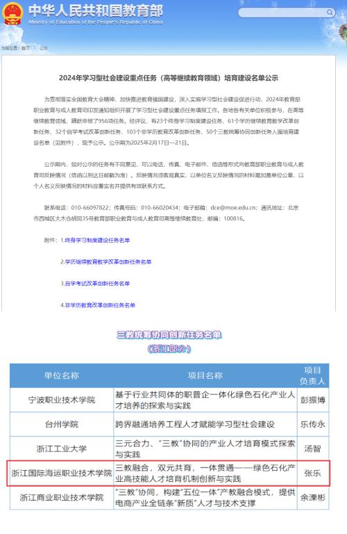 近日,教育部公示了2024年学习型社会建设重点任务(高等继续教育领域)培育建设名单,浙江省共入选17项。由我校东海教育学院组织,石油化工学院联合岱山县职业技术学校和岱山县东沙园区管理服务有限公司共同参与申报的《三教融合,双元共育,一体贯通——绿色石化产业高技能人才培育机制创新与实践》项目入围“三教统筹协同创新任务”,标志着我校三教统筹协同创新发展工作得到教育部的认可。项目准备与申报期间,石油化工学院与东海教育学院组织团队认真研读相关文件精神,积极协调内外部资源,精心精细完成项目申报工作。