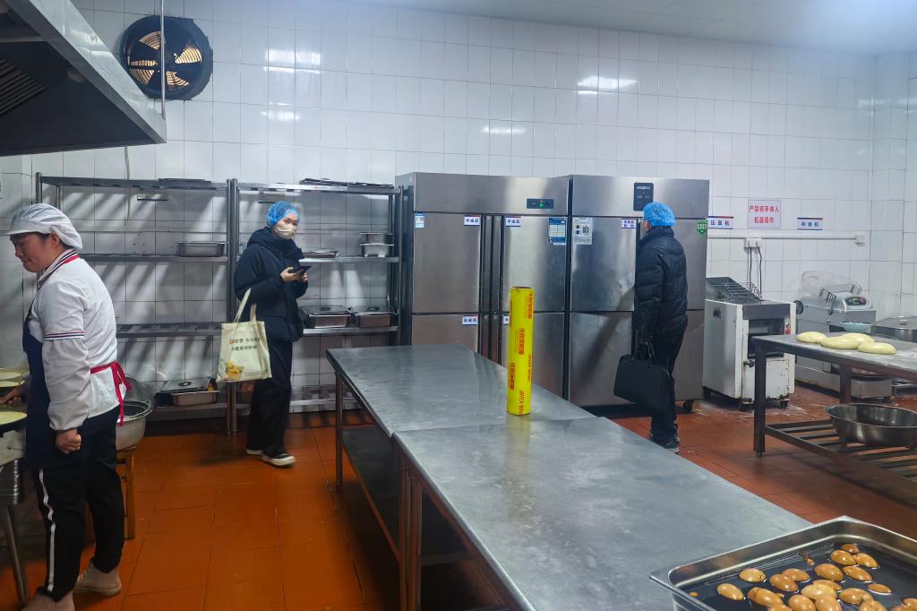 在加工操作间里,检查人员不放过任何一个细节。他们查看了厨师们的操作流程,强调生熟食材必须严格分开,避免交叉污染。对于餐具清洗消毒区域,工作人员检查了清洗设备的运行情况,以及餐具消毒记录,确保每一套餐具都经过规范的清洗消毒程序,为师生提供安全卫生的用餐器具。