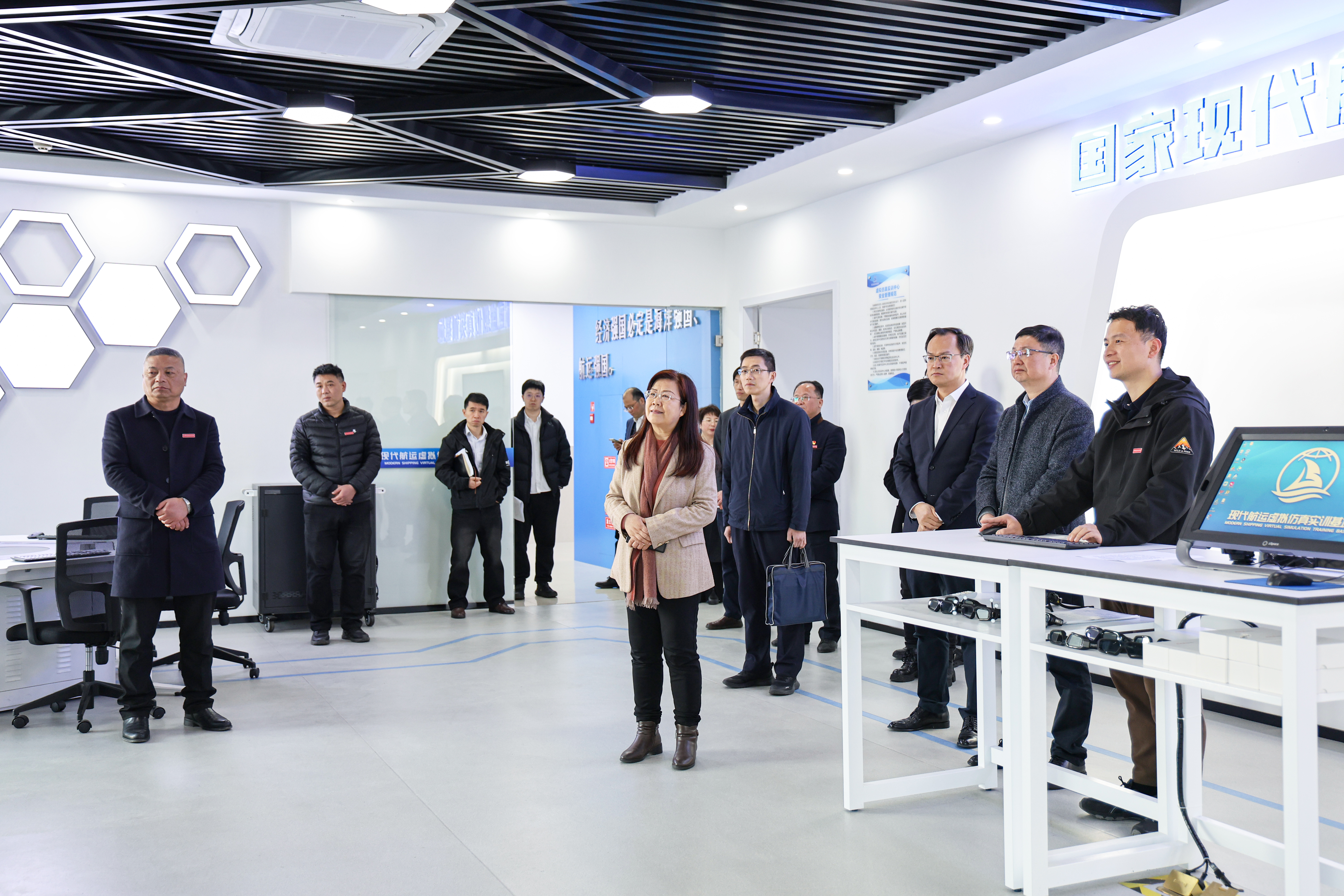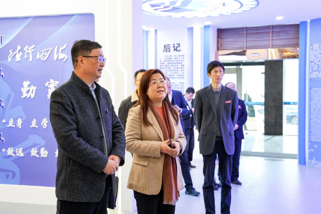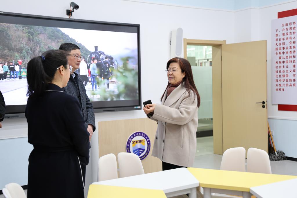 张燕一行参观了校史馆、航海操纵模拟器、国家级现代航运虚拟仿真实训中心、舟山市大中小学思政教育一体化基地、海邮驿站等产教融合实践中心。