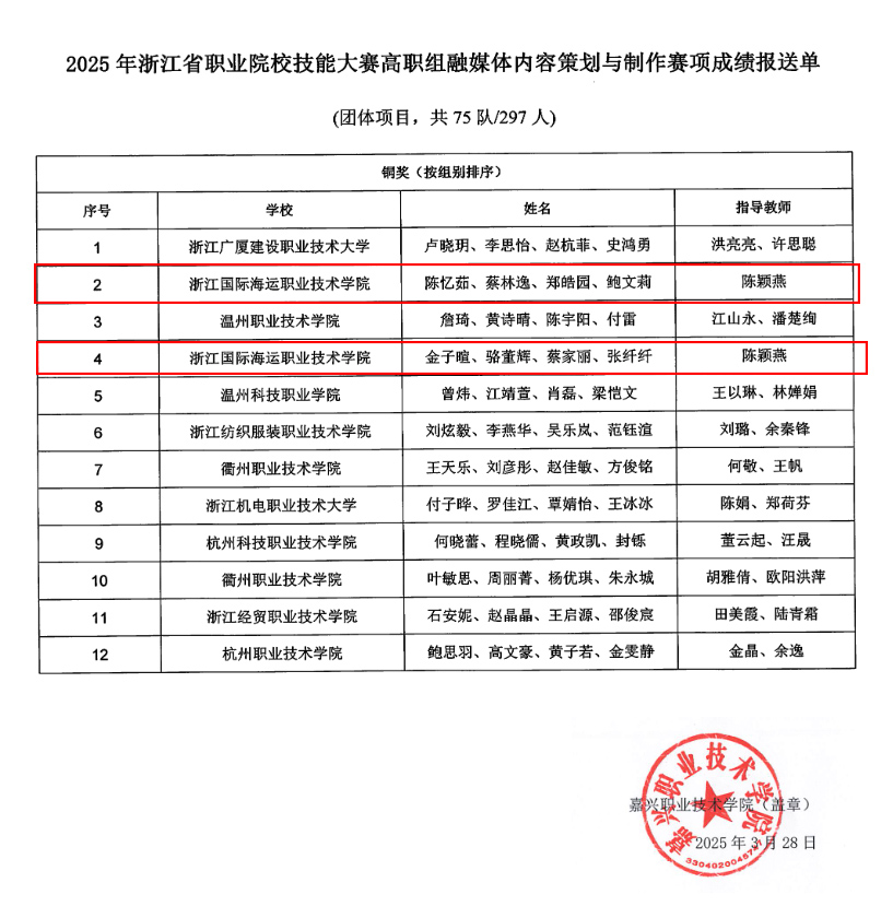 在3月25日-26日举办的2025年浙江省职业院校技能大赛高职组“融媒体内容策划与制作”赛项中,由现代港口贸易学院数字媒体艺术专业陈颖燕老师指导,陈忆茹、蔡林逸、郑皓园、鲍文莉组成的第1团队,以及金子暄、骆董辉、蔡家丽、张纤纤组成的第2团队,经过激烈角逐,从全省39所院校(包含本科类职业大学)75支参赛队伍中脱颖而出,双双斩获铜奖,实现我校在该赛项的零突破。
