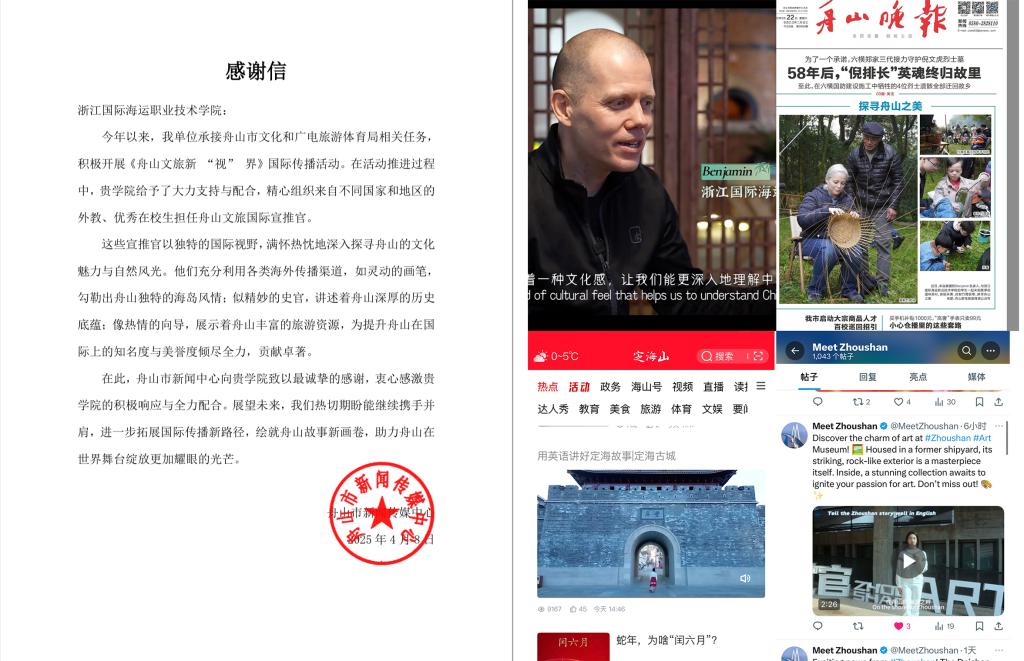 近日,我校收到了来自舟山市新闻传媒中心感谢信,高度肯定我校在“舟山文旅新‘视’界”国际传播活动中所做的突出贡献。自2024年12月“海韵英语桥”平台成立以来,国际教育学院以语言为纽带,深化校地合作,组织中外师生投身舟山文旅国际宣推工作,通过多元实践赋能城市形象传播,交出了一份亮眼的“国际表达”成绩单。
