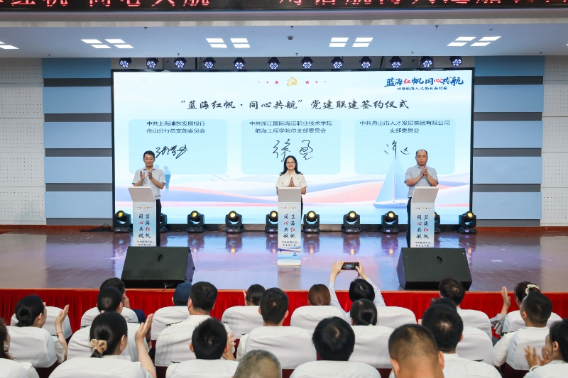 在现场师生共同见证下,航海工程学院党总支、中共舟山市人才发展集团有限公司支部委员会、中共上海浦东发展银行舟山分行总支部委员会签署党建共建协议。校党委副书记孔志光、舟山海投公司党委书记田力军、浦发银行舟山分行行长张春龙共同为“蓝海红帆·同心共航”联建项目揭牌。三方将整合教育、人才、金融资源,在航海专业人才培养、船员职业发展、产业生态优化等领域深化合作,构建常态化协同机制。