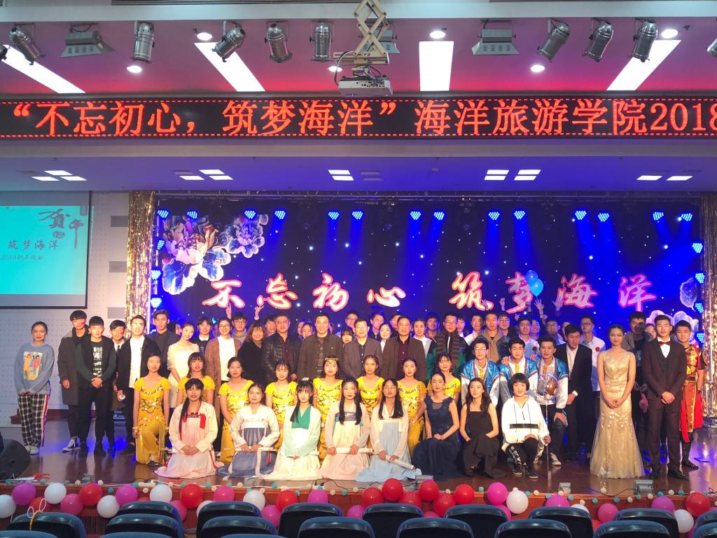 1月3日晚,海洋旅游学院在图书馆报告厅举行了“不忘初心、筑梦海洋”2018新年晚会,校党委副书记胡国光、学院全体教职工和近五百名学生共同观看了演出。