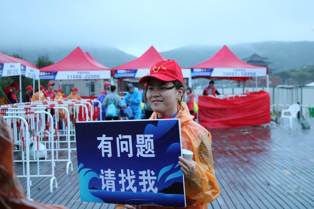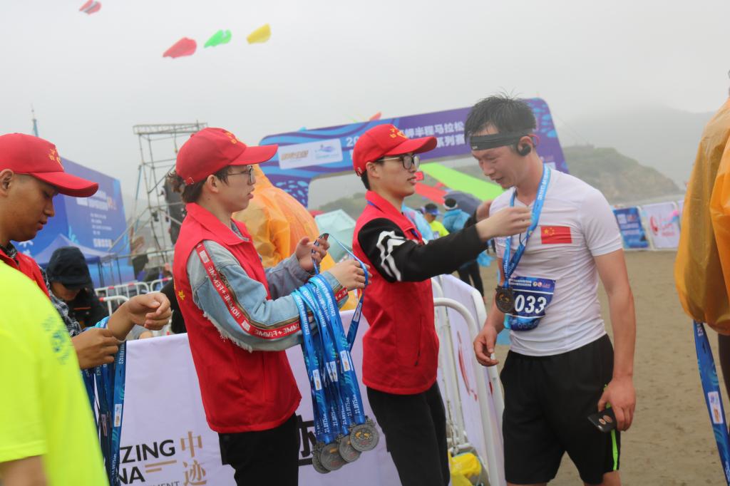 在岱山后沙洋,志愿者们顶风冒雨迅速到达各自岗位执行任务。期间,引导咨询组同学在组长钱璐的带领下,在存衣区集合拿“有问题请找我”手举牌,耐心回答运动员所遇到的问题,帮助运动员前往检录处并提醒他们做好赛前准备;后勤组同学在组长陈俊杰、虞博文带队下负责物资搬运,两千多名选手的物资在志愿者们手中传递和分类;终点服务组的许斌、王泉辉等同学认真做好奖牌的发放;李慧兰和高晶露同学参加了最后颁奖典礼的服务;许泽军同学负责穿针引线和为大家拍照。在赛事全部结束后,志愿者分批安全返回校区。
