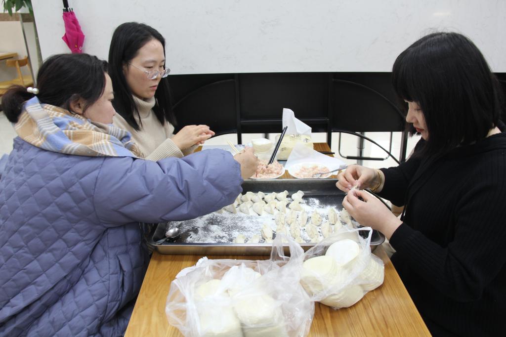 活动中,女同胞们个个热情高涨,摩拳擦掌,围坐一起展示包饺子手艺。男同胞们也踊跃参与其中露一手。现场欢声笑语,其乐融融。不一会儿功夫,一笼笼白嫩嫩如元宝般的饺子就包好了,紧接着一盘盘热气腾腾、香喷喷的煎饺、蒸饺、煮饺纷纷端上桌,全体教职工们一起分享着,快乐着。
