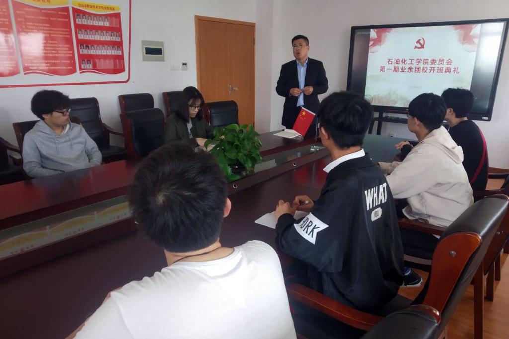 4月17日中午,石油化工学院第一期业余团校开班仪式在岱山校区行政楼508会议室举行。石油化工学院党总支书记郑忠义、院团委负责人秦传高、辅导员孙丹晔参加开班仪式。