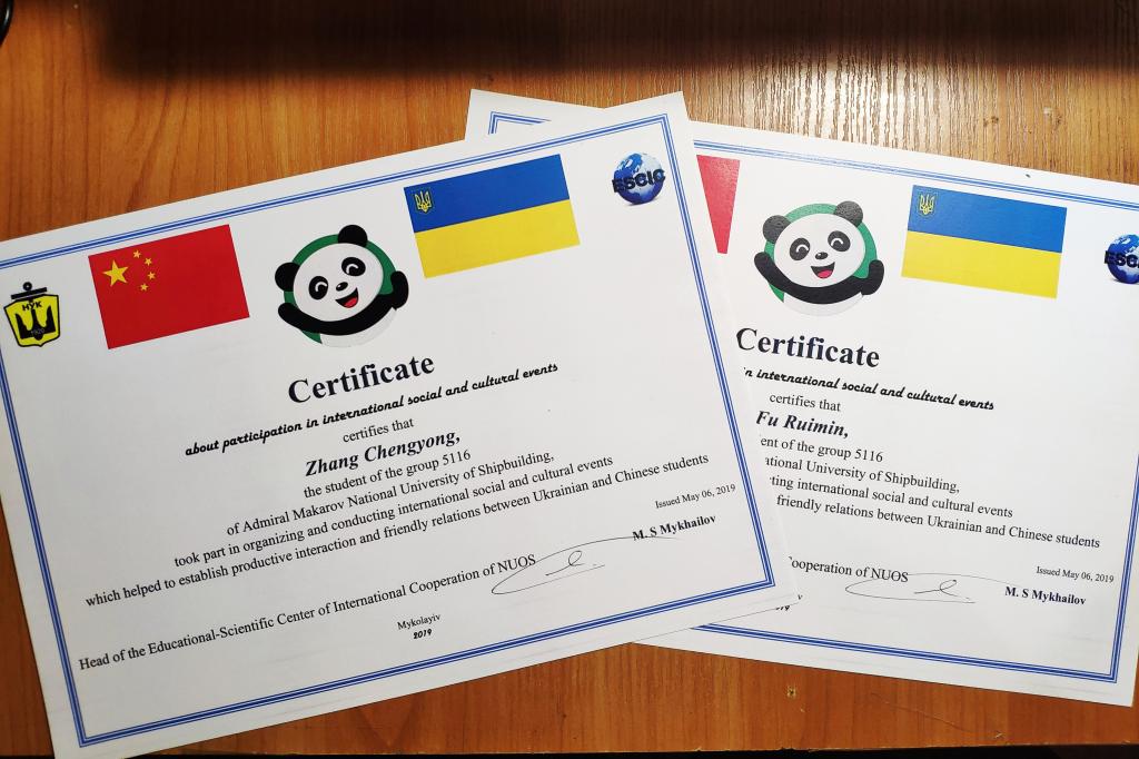 乌克兰当地时间5月6日,马卡洛夫国立造船大学国际部向积极组织参与各类活动的在乌中国留学生颁发奖状,我校2014届中乌合作专业毕业生张程勇、傅睿民和2014届机电一体化技术专业毕业生沈国栋获此奖励。国际部领导Елена Гончарова向获奖同学表达了祝贺。她说,每一次活动都代表着中乌友谊的进一步加深,希望在今后能有更多的合作机会,让更多的中国留学生和乌克兰学生参与进来。 (乌克兰海运留学生联合会 张程勇)