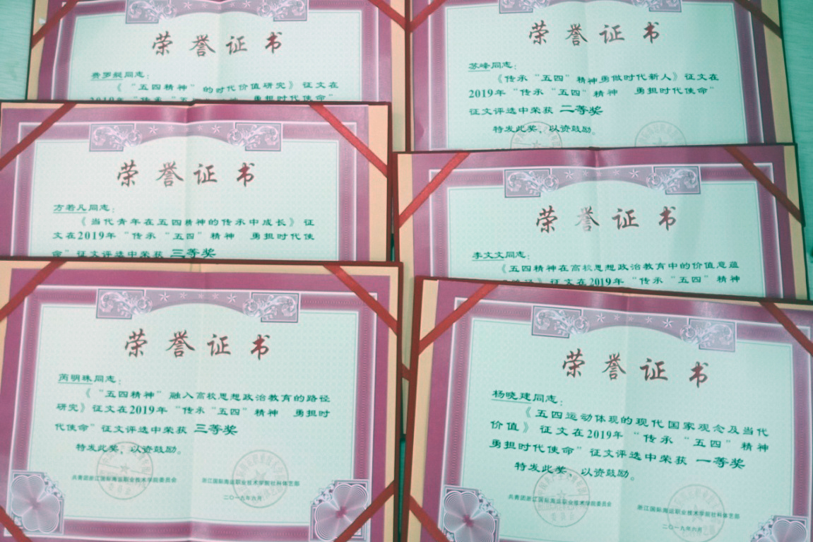 自发布征文通知以来,学校广大师生围绕“传承‘五四’精神,勇担时代使命”主题,积极撰写研究论文,踊跃投稿,截止5月底收到征文共计30余篇。经校内外专家认真评审,共评选教师组优秀论文6篇,其中杨晓建撰写的《五四运动体现的现代国家观念及当代价值》获一等奖;李文文撰写的《五四精神在高校思想政治教育中的价值意蕴及实现路径》和苏峰撰写的《传承“五四”精神勇做时代新人》获二等奖;芮明珠撰写的《“五四精神”融入高校思想政治教育的路径研究》、费罗挺撰写的《“五四精神”的时代价值研究》及方若凡撰写的《当代青年在五四精神的传承中成长》获三等奖。共评选学生组优秀论文13篇,其中港口管理学院赵金波的《百年转瞬即逝 五四永垂不朽》、石油化工学院范嘉树的《“小确幸”之外》和《时代留住我的梦》获一等奖;航海工程学院蔡均益的《传承五四精神,勇担时代使命》、石油化工学院刘陆琪的《五四浇筑青春梦,青春共建新时代》、船舶工程学院于建立的《传承“五四”精神 勇担时代使命》和航海工程学院郑少秋的《奋发有为承五四,新时代里勇登峰》获二等奖;航海工程学院徐宇晨的《天选之子,时代之召》、傅路云的《弘扬“五四”精神, 奉献火热青春》、章锦成的《铭记“五四” 做新时代领航人》、陈晨的《传承百年“五四”精神,在奋斗中担当民族复兴大任》及船舶工程学院夏聪聪的《“五四”百年 力量青春》、港口管理学院魏海楠的《弘扬五四精神,勇当时代先锋》分获三等奖。