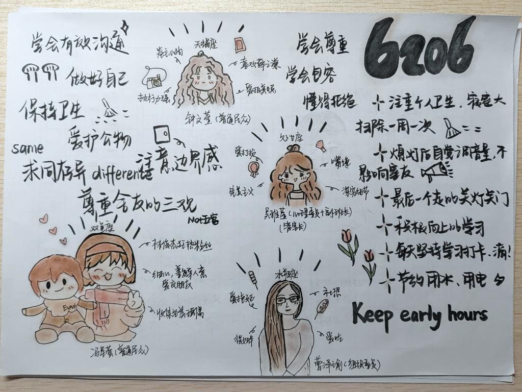 有的寝室制作了手绘名片、有的寝室则是真人入镜、有的展现出了每位成员的性格特征、有的则巧妙加入了寝室公约……同学们发挥自己的创意,为自己的大学寝室生活留下了具有纪念意义的名片。