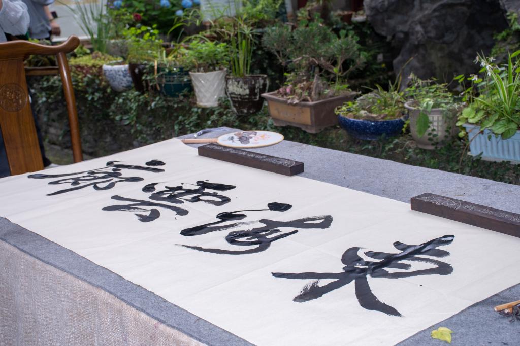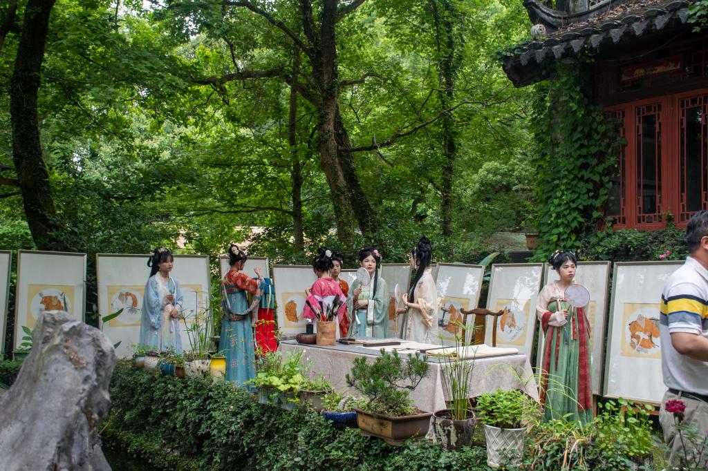 书画展现场,师生们挥毫泼墨,以笔传情,用墨达意,进行了书画交流。同学们还进行了汉服雅集和琴艺展示,将中华传统文化带入山庄。