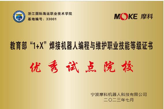 近日,我校被教育部1+X“焊接机器人编程与维护”职业技能等级证书的培训评价组织宁波摩科机器人科技有限公司授予1+X职业技能等级证书“焊接机器人编程与维护”考核认证基地,并荣获“优秀试点院校”称号,以表彰我校在1+X试点推进工作中所作出的突出贡献。