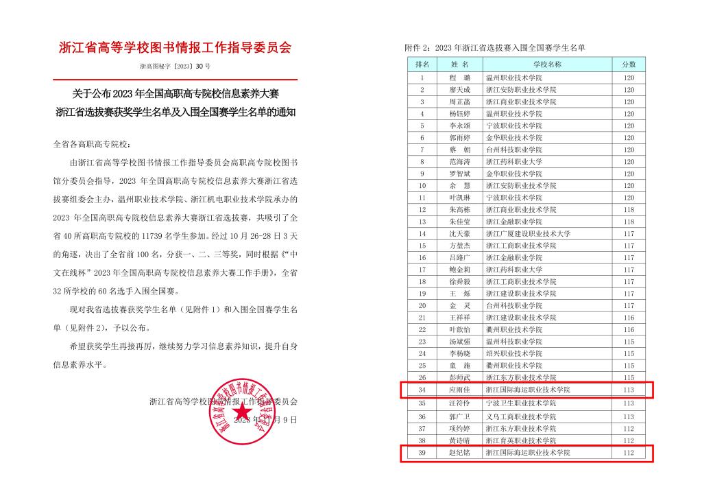 2023年全国高职高专院校信息素养大赛浙江省选拔赛于10月26日至28日举行,共吸引了全省40所高职高专院校的11739名学生参加。经过3天激烈角逐,我校2023级商务英语2班应雨佳、2023级港口与航运管理2班赵纪铭两位同学通过浙江省选拔赛,获得参加全国比赛的资格。