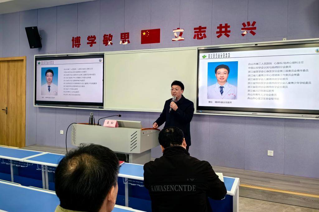 为进一步提升学校心理健康教育水平,加强医校合作,12月27日下午,学校心理健康教育中心邀请舟山第二医院心身医学科袁松主任来校讲授“校园心理危机识别与干预”专题讲座。校党委副书记孔志光、学工部部长芮明珠、学校专兼职心理健康教育教师、全体思想政治辅导员、全体班主任、全体二级学院副书记参加了此次讲座。