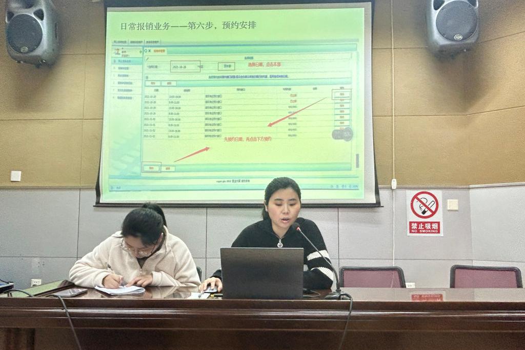 会议第二阶段进行了教职工财务制度培训。学校计财处张莉莉和童梦婷两位老师对学校最新财务制度进行了解读,对财务报销流程规范、财务系统使用方法和注意事项等向全体教职工做了宣贯。
