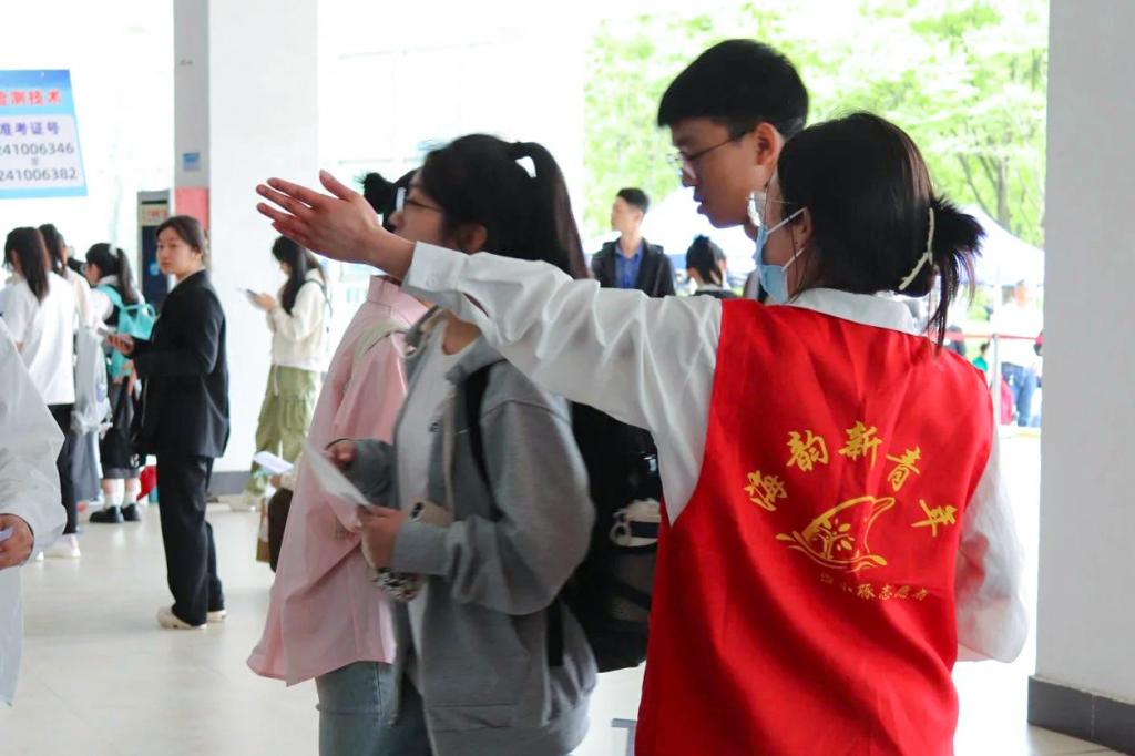 “同学你好,请问你报考的是什么专业?”“同学你好,请问你需要什么帮忙?”在志愿者的悉心引导下,考生有序地完成刷卡验证、寄存物品、安全检查等流程,顺利进入候考区等待考试。志愿者们满腔热情,身着红马甲,穿梭在人群中,引导一批又一批的考生。志愿者们热诚的欢迎每一位考生的到来,忙碌的身影在校园内绘就了一道靓丽的风景线。