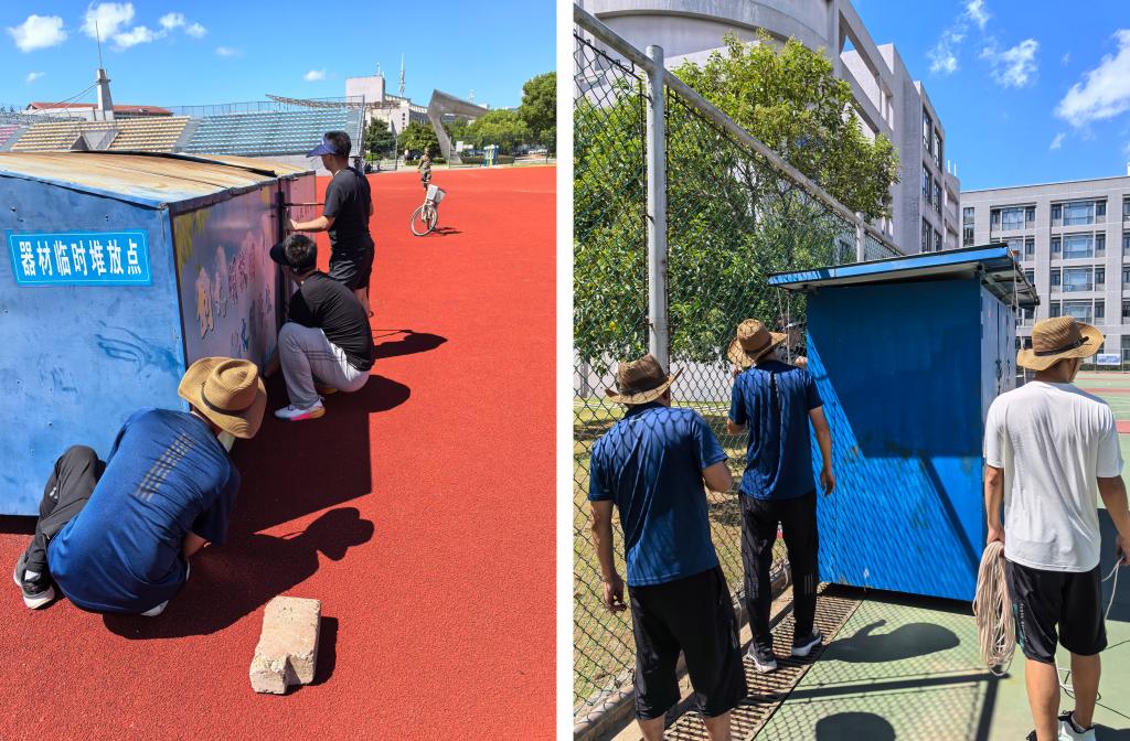 文化体育部检查了电钢琴房、舞蹈房和体育馆门窗关闭情况,对室外篮球场储物柜、田径场跳高垫进行加固,游泳池、跳水池、及体育场馆楼顶进行垃圾清理,并及时做好安全防范措施。(文化体育部)