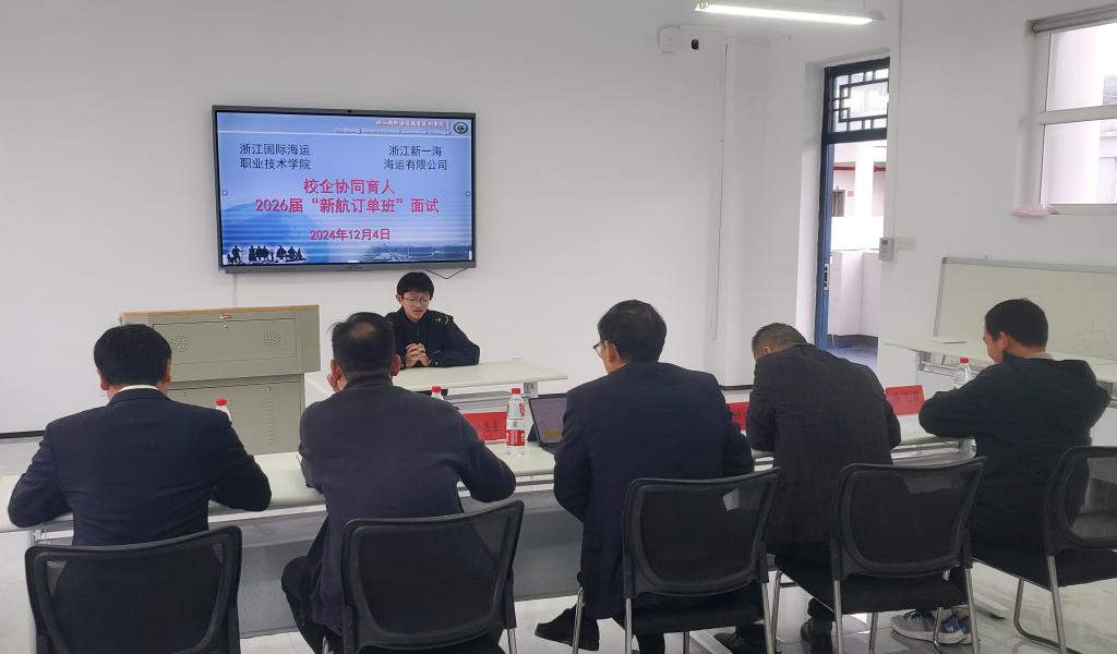 为更好培养适应航运业需求与经济社会发展需要的高素质人才,推动职业教育与企业需求的无缝对接,落实我校与浙江新一海海运有限公司签订“新航”订单班协议,12月4日,航海工程学院在2509教室举行了2026届“新航订单班”面试工作。