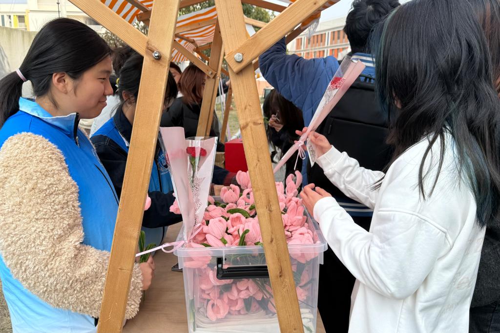 院团委学生会以及平安守护联盟社团成员花费两天时间用扭扭棒精心制作了数百朵精美手工花,女生们纷纷在便签上写下对女生的祝福、自我鼓励以及对未来的期许,随后前往奖品处领取手工花和可爱小礼品。一张张普通便签,承载着女性的爱与善良。