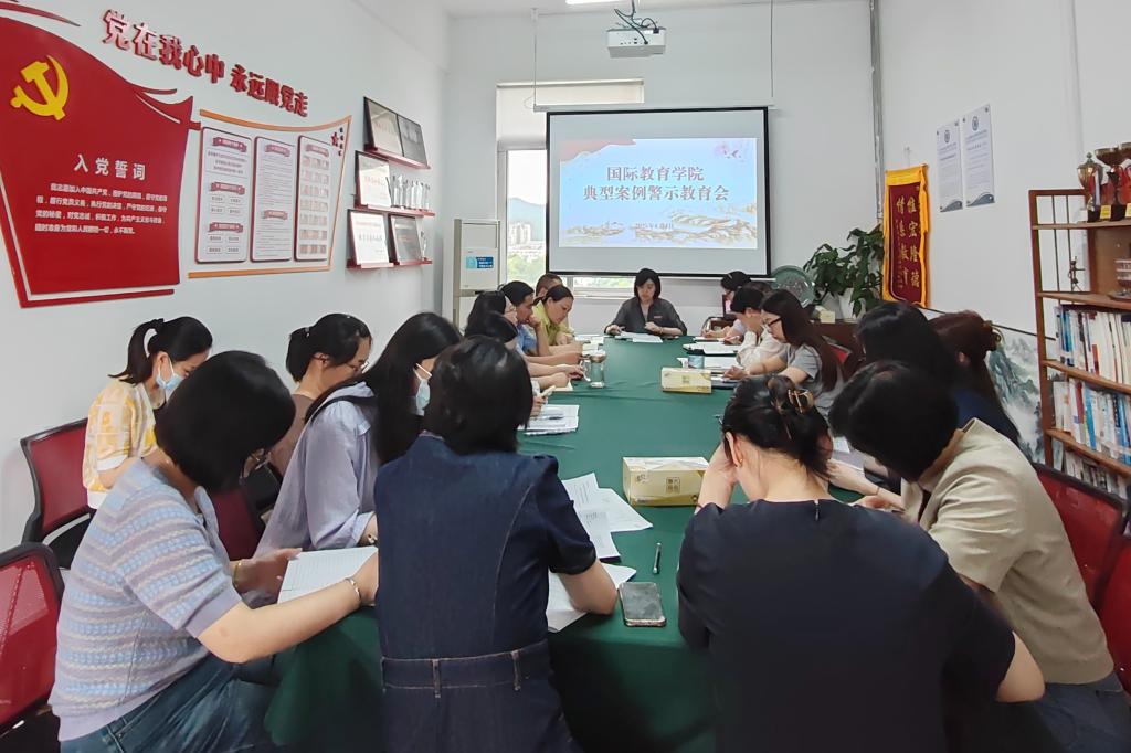 为深入贯彻中央八项规定及其实施细则精神,进一步推进全面从严治党向纵深发展,6月4日,国际教育学院在海智楼1501会议室召开典型案例警示教育会,会议由党总支书记金洁主持,学院全体教师参加会议。